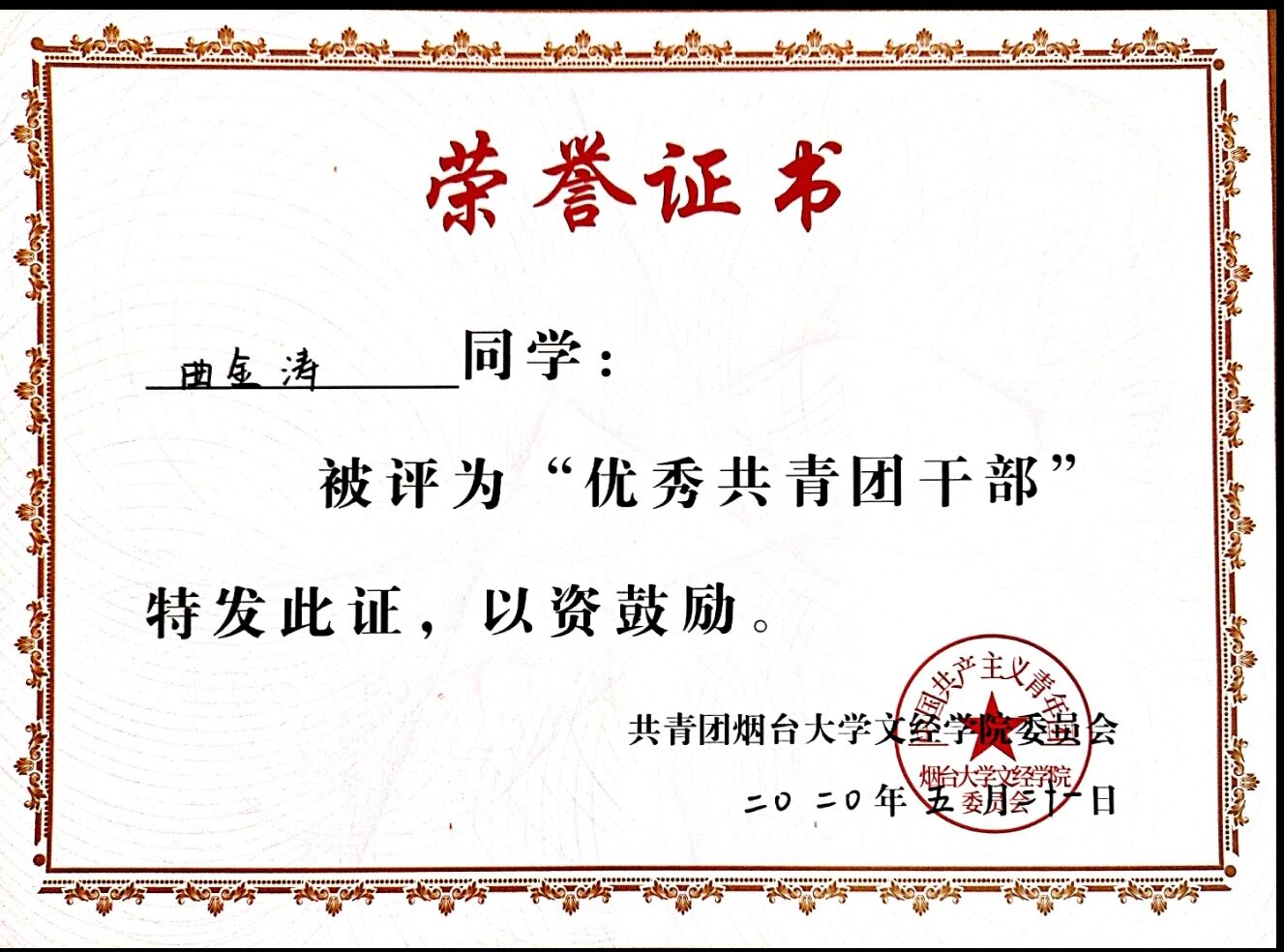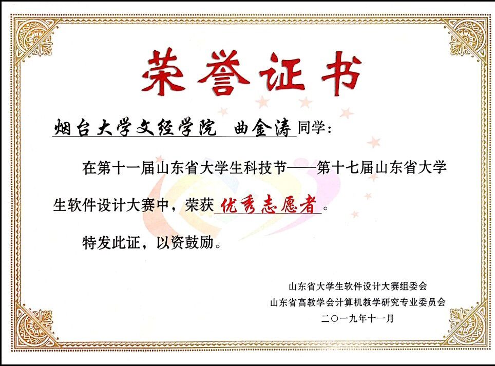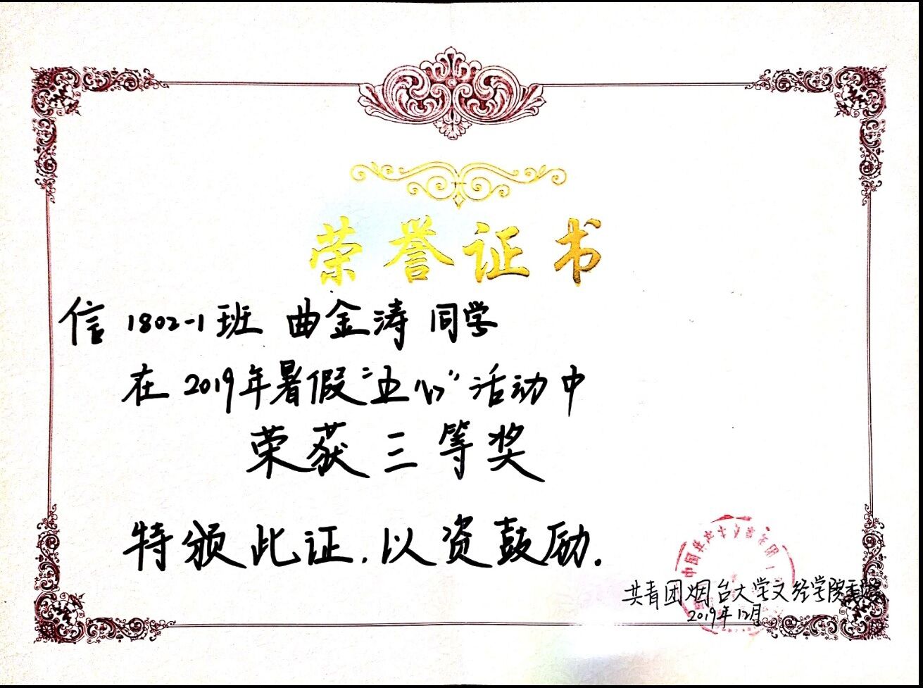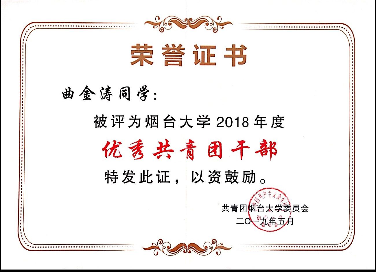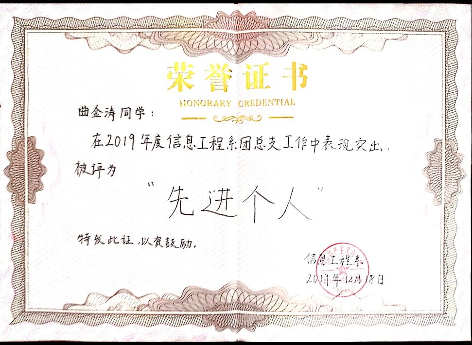 曲金涛,男,1999 年12月出生,团员,汉族,本科在读,永利集团信息工程系计算机科学与技术专业,现担任永利集团信息工程系团总支宣传部部长、信1802-1班团支部的组织委员。入校以来严格遵守学校的各项规章制度,做好模范带头作用。平日我妥善处理好班级工作以及和同学之间的关系,在各个方面取得了较大的进展。在学习上我比较系统的学习并掌握了较为扎实的专业知识获得国家级比赛奖项一项,省级比赛奖项四项,学校组织各类活动获奖十余项,连续三年获评烟台大学年度优秀共青团干部、“优秀学生干部”荣誉称号。在思想积极要求上进,不断提高政治素养,积极向党组织靠拢。积极组织及参加各类实践活动,在暑假期间赴临沂革命老区进行社会实践调研活动,获得校级优秀社会实践论文二等奖。疫情期间积极联系帮助当地学校,村委会进行疫情防控工作。获山东省大学生软件设计大赛三等奖、山东省大学生物理科技创新大赛一等奖、全国大学生数学建模竞赛山东赛区三等奖、烟台大学2020年度大学生“三下乡“社会实践优秀论文二等奖、烟台大学文经学院“优秀学生干部”荣誉称号等十余项奖项。
