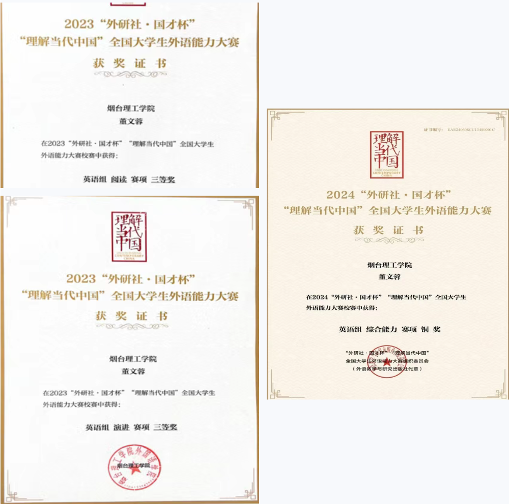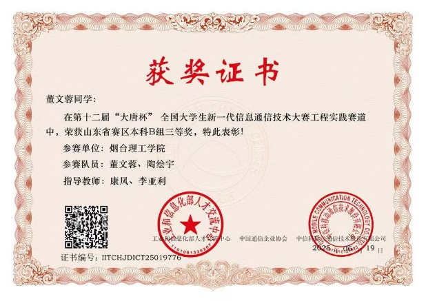 董文蓉将专业提升作为核心追求,在学科竞赛中勇毅前行。2024年山东省大学生物理实验竞赛中,她深耕原理、查阅文献、反复调试,以工匠般的严谨打磨实验,终获省赛二等奖;2025年“大唐杯”全国大学生新一代信息通信技术大赛中,她与队友携手协作、屡败屡试、总结精进,斩获省三等奖,在竞技中锤炼专业硬功。