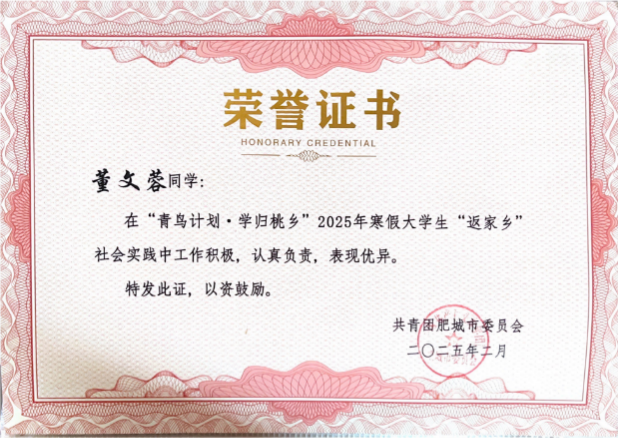心怀大爱,情暖人间。董文蓉始终践行奉献精神,积极参与各类公益活动。2025年寒假,她通过“青鸟计划·学归桃乡”返家乡社会实践,深入肥城老家,为老人们送去生活用品与陪伴关怀,用点滴行动传递温暖,彰显青年担当。