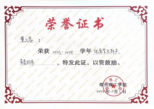 “勤能补拙是良训”是董文蓉的坚守。课堂上,她全神贯注紧跟讲解,深耕知识细节;遇疑必问、刨根究底,在求知路上步履不停。这份勤勉让她以2023—2024学年专业榜首之姿脱颖而出,身为班级学习委员,她巧妙平衡学业与工作,引领同窗共探学海。不懈奋斗终结硕果,她先后斩获2025年国家奖学金、2024年祥隆奖学金,摘得2024年“优秀学生标兵”、2025年“校级优秀团员”等殊荣,每一项荣誉都是她汗水的见证。
