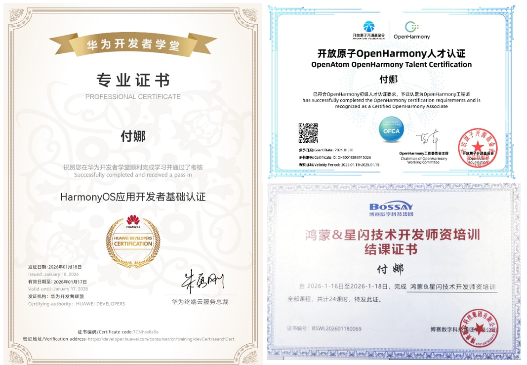 本次培训还为考核合格的教师颁发了开放原子开源基金会“OpenHarmony人才认证证书”与华为开发者学堂“Harmony应用开发者认证证书”,付娜老师顺利通过考核并获得双认证,进一步提升了我院在信息技术领域的师资水平与行业影响力。