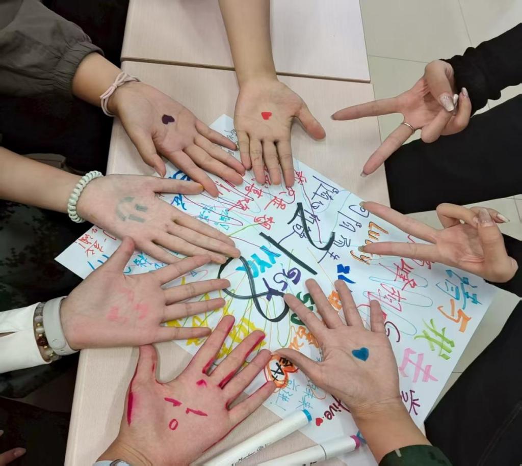 为破解这一难题,yl9193永利集团开展了一场名为 “请与我击掌” 的心理活动。活动现场,绘满多彩文字与图案的纸张铺展在桌面上,那是大家对大学生活的期许与感悟。参与者们伸出手掌,有的画着俏皮的笑脸,有的绘着温暖的爱心,还有的用色彩勾勒出独特的符号,然后与同伴们轻轻击掌。