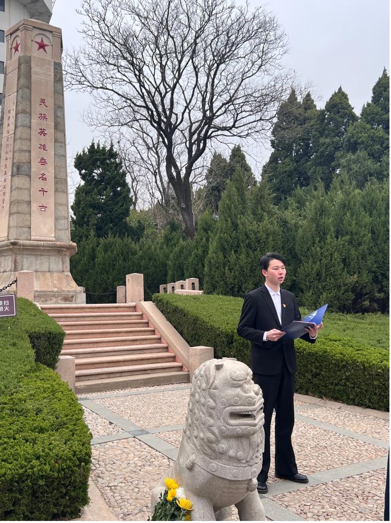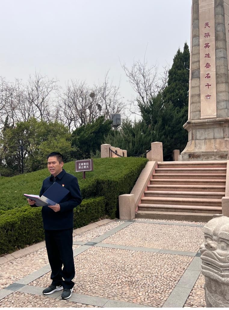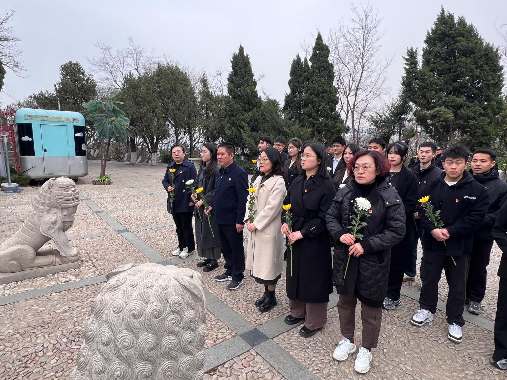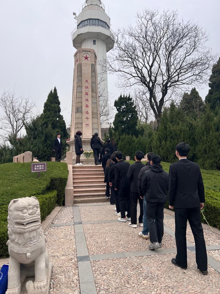 首先,王明印书记强调了革命先烈们为国家独立、民族解放所做出的伟大牺牲,激励同学们铭记历史,传承和弘扬英烈们的崇高精神。随后,学生党员代表陈鲁川发言,言辞激昂地表达了对先烈的敬仰以及传承红色精神的决心,并表示作为新时代的学生党员,将以先烈为榜样,肩负起时代赋予的责任与使命。紧接着,全体党员面向党旗,重温入党誓词,铿锵有力的誓言回荡在烟台山的上空,展现了大家对党的忠诚和为共产主义事业奋斗终生的坚定信念。宣誓完毕,全体党员怀着崇敬的心情献上手中的鲜花,缓缓走过烈士纪念碑,近距离感受烈士们的伟大精神。最后,大家向为国捐躯的革命烈士行三鞠躬礼,以传统礼仪表达对先烈们的崇高敬意。