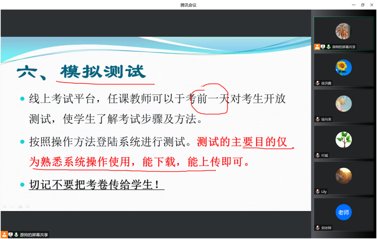 会议伊始,副院长原帅就学校决定对期末进行线上考试的整体安排做出了部署,并就落实考前命题、考试平台培训、考试巡考、监考、考后阅卷归档等工作提出要求。他要求,各任课教师要精心组织好期末线上考试,保证考试能够安全、平稳、有序进行。随后,原院长就如何使用超星考试平台进行线上考试作讲解,并对考试过程中可能遇到的问题进行解答。