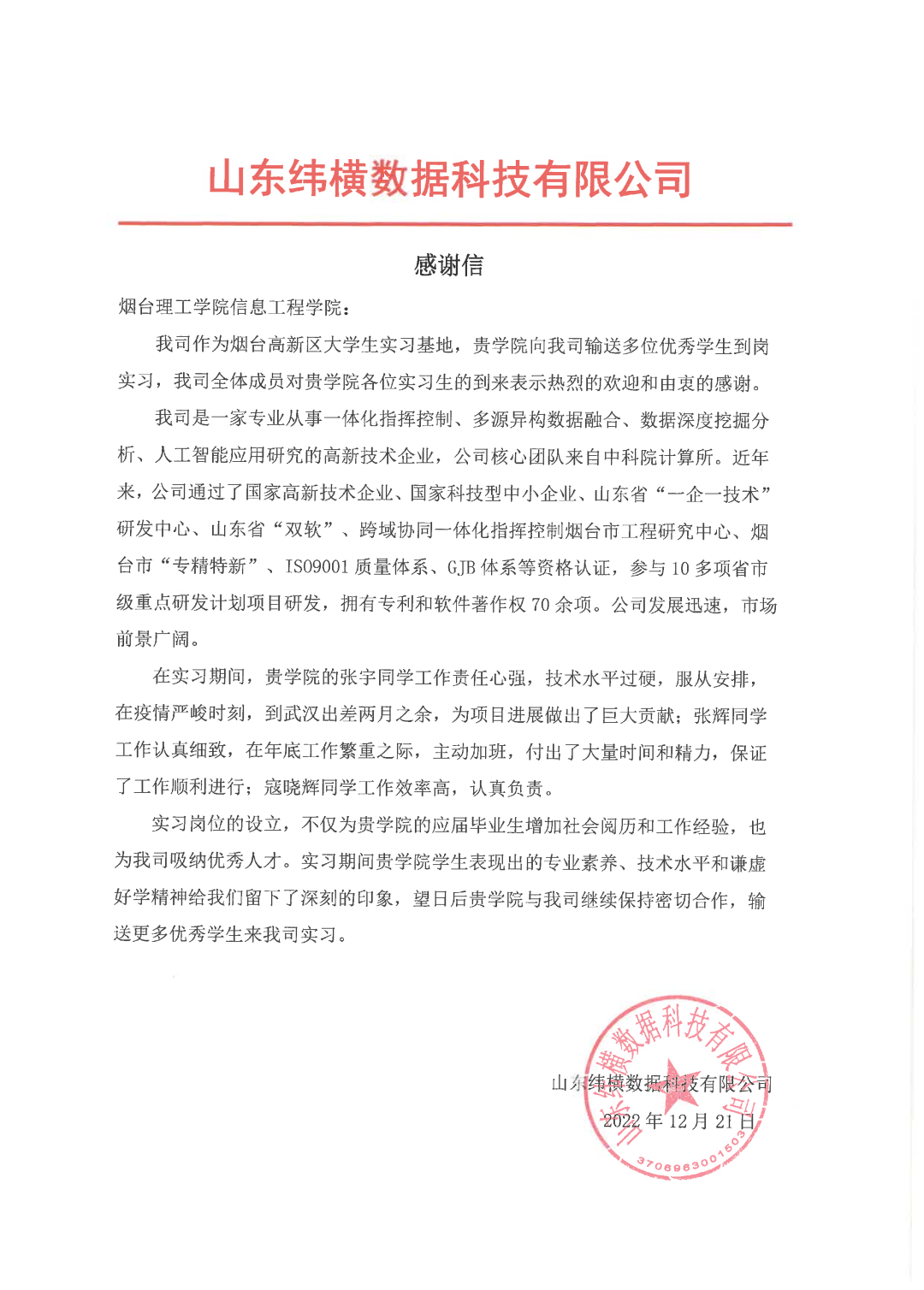 山东纬横数据科技有限公司是一家专业从事一体化指挥控制、多源异构数据融合、数据深度挖掘分析、人工智能应用研究的高新技术企业,公司核心团队来自中科院计算所。实习期间,张宇同学工作责任心强,技术水平过硬,服从安排,在疫情严峻时刻,到武汉出差两月之余,为项目进展做出了巨大贡献;张辉同学工作认真细致,在年底工作繁重之际,主动加班,付出了大量时间和精力,保证了工作顺利进行;寇晓辉同学工作效率高,认真负责。看到感谢信后,他们感动之余,纷纷表示将此作为工作动力,继续脚踏实地的做好应做的事,加强自身能力,认真听从老师的教导,向公司前辈学习。他们展现了当代大学生敬业奉献的精神面貌,为同学们树立了良好榜样,也为学院在人才培养方面创下了良好的口碑。
