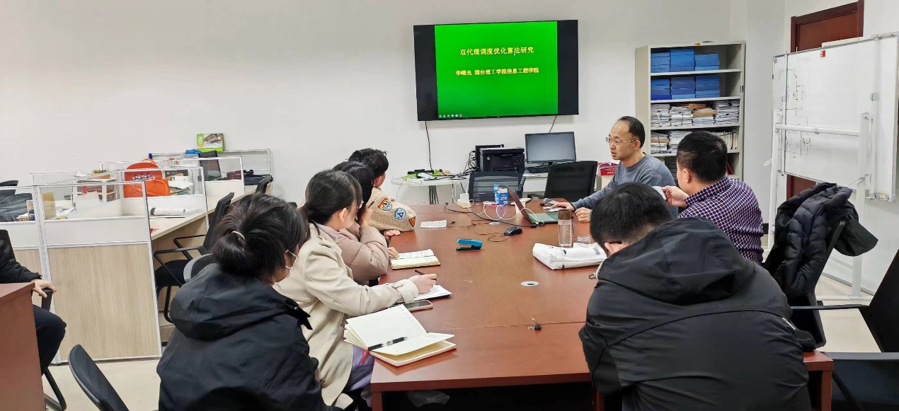 3月18日下午,yl9193永利集团科研讨论班第2讲“双代理调度优化算法研究”在综合楼343举行,我院青年教师参加了本次讨论班。李曙光教授结合自己的科研经历和带研究生的丰富经验,从多个角度对双代理调度算法进行了深入剖析,并为在场的青年教师们提供了宝贵的科研指导。