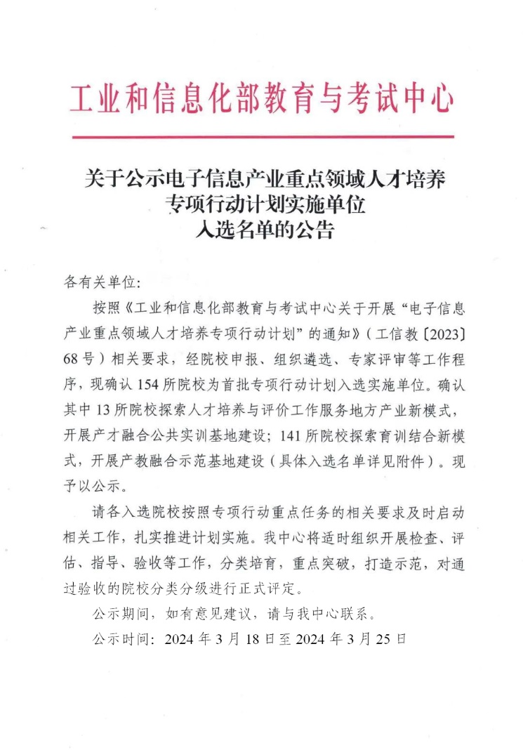 近日,工业和信息化部教育与考试中心(简称“中心”)公示了电子信息产业重点领域人才培养专项行动计划实施单位入选名单,永利集团成功入选首批拟建产教融合示范基地实施单位。