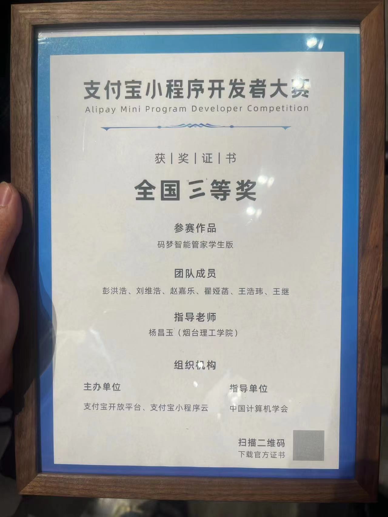 在本次大赛中,“文明和谐友善队伍”由骨干成员彭洪浩和刘维浩组成。他们的作品“码梦智能管家学生版”凭借其创新性和实用性,受到了由清华大学、北京大学、浙江大学、上海交通大学、中山大学等985高校院长教授以及蚂蚁集团技术负责人组成的评委专家们的高度评价。该作品旨在帮助学生更有效地管理学习和日常生活,通过智能小程序提升学生的生活质量和学习效率。