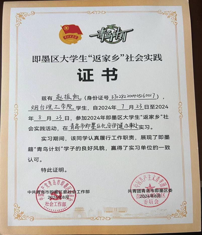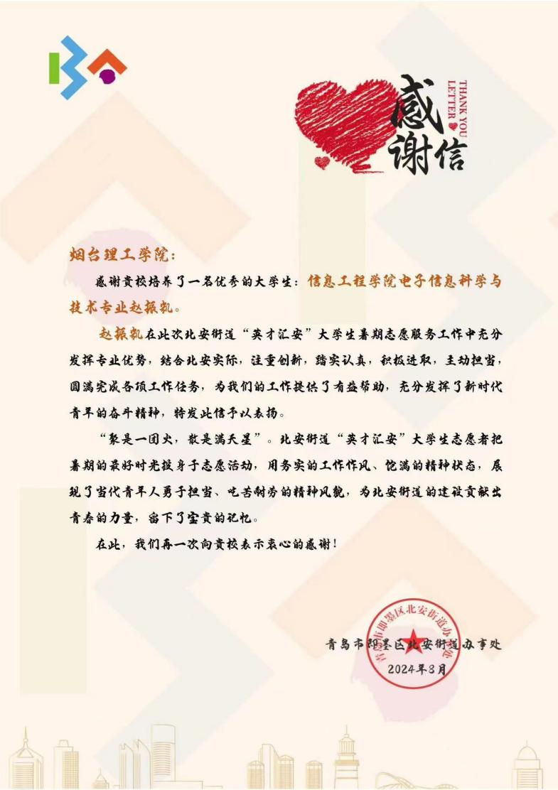 近期,学校收到一封来自山东省青岛市即墨区的感谢信。信中,北安街道办事处高度赞扬了我校信工学院学子赵振凯在参加“英才汇安”大学生暑期志愿服务工作中的奋斗精神和出色表现,同时向学校培养优秀人才表示衷心的感谢。