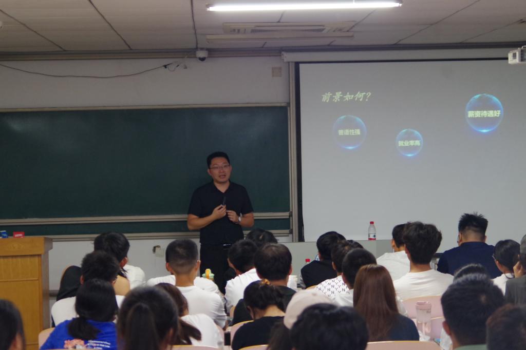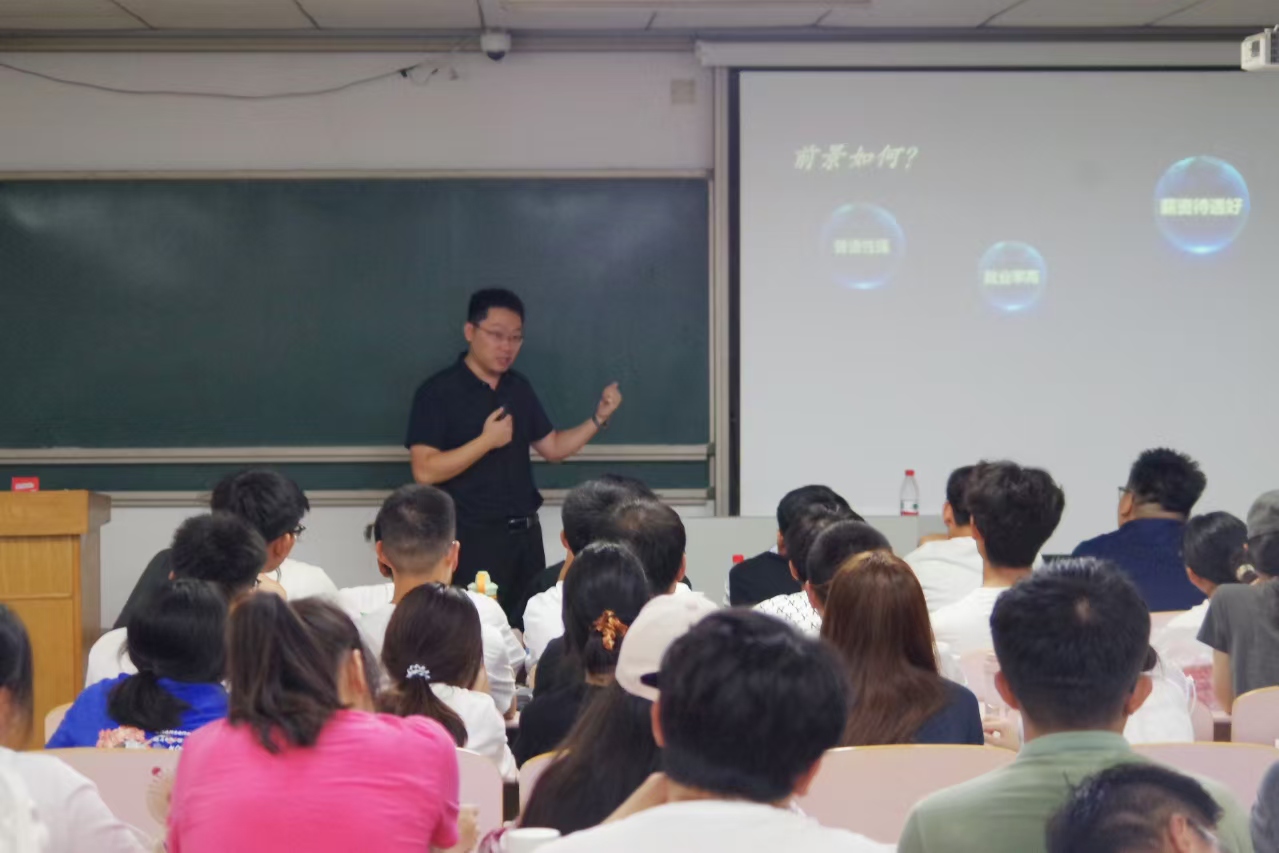 讲座伊始,王老师向同学们介绍了职业生涯的概念,并通过生动的案例分析及实用技巧的分享,引导新生提高自我认知、职业认知、找准职业发展方向、定位职业目标、合理规划职业路径,制定实施计划。随后,王老师为同学们介绍专业发展概况、历届就业及深造情况、用人单位看重的能力和素质,从而引起学生对职业生涯规划的思考和重视。他还建议同学们要深入了解专业的课程设置和课程体系、人才培养目标以及专业就业方向和就业情况,了解专业、读懂专业、融入专业,尽快适应大学生活,以此奠定职业方向探索的基础。他强调,要提前了解好想要的生活和岗位与现在专业的关系,提早谋划,未雨绸缪。最后,王老师指出在大学阶段,同学们应该保持正确的自我认知,立足个人特质,明确自身发展方向。