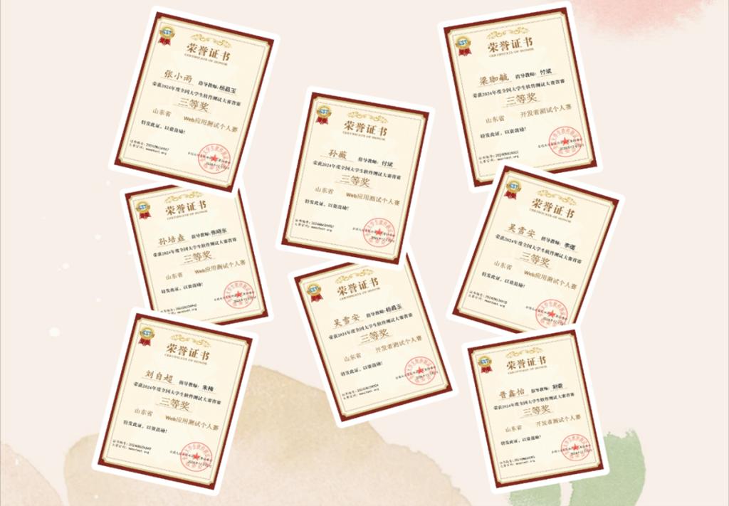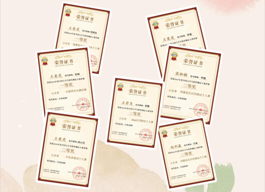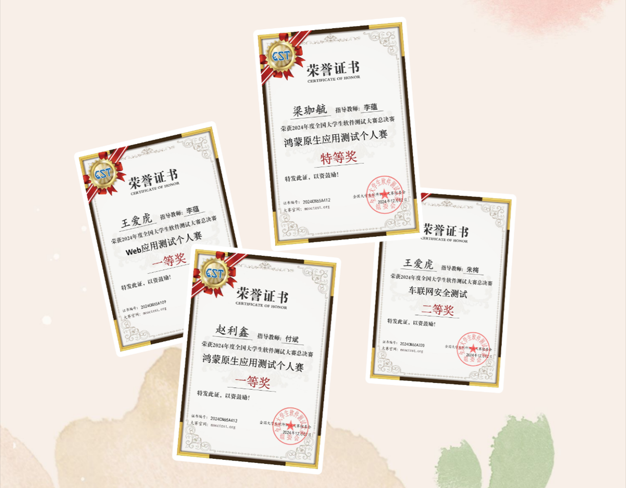 省赛于2024年10月26-27日在青岛科技大学举行,我校学子参加了“拓思杯”开发者测试大赛、“慕测杯”Web应用测试大赛、“控安杯”车联网安全测试大赛和“华为杯”鸿蒙原生应用测试大赛四项比赛,获得省赛一等奖3项、省赛二等奖4项、省赛三等奖8项、省赛优胜奖7项。王爱虎、梁珈毓和赵利鑫三位同学入围了全国总决赛的6项赛事,其中王爱虎同学一人入围4项全国总决赛资格,是我校软件工程专业首位获得该赛事4项入围全国总决赛资格的优秀学子。