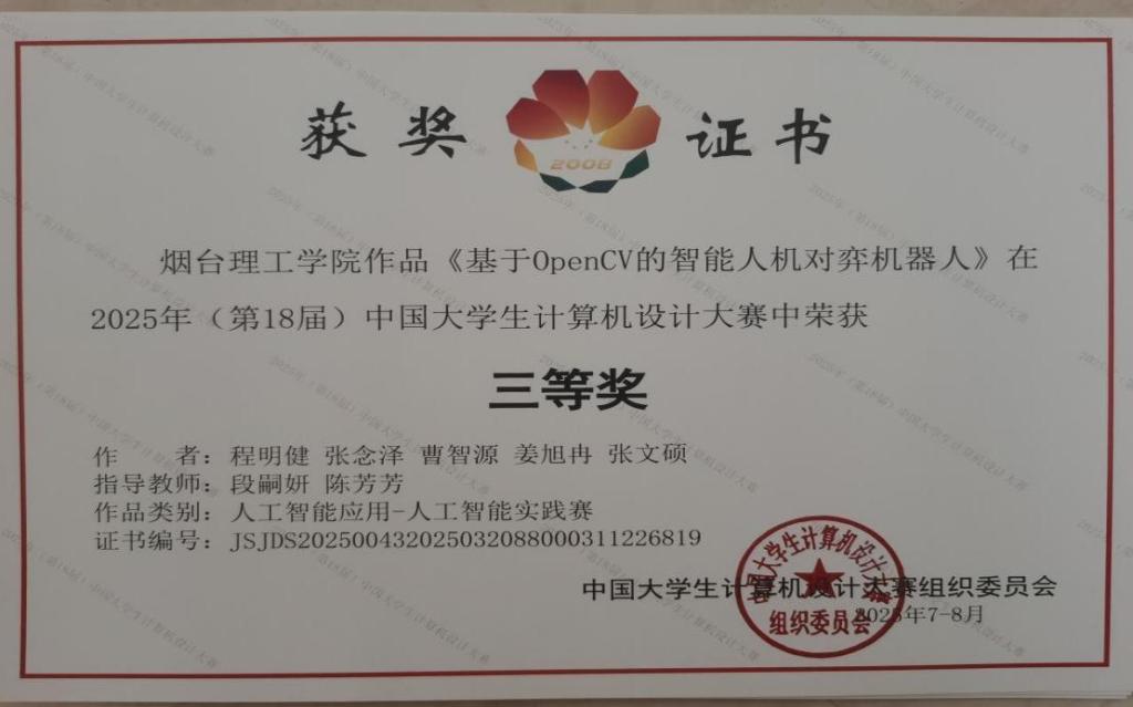近日,2025年(第18届)中国大学生计算机设计大赛“人工智能应用”类作品全国总决赛在东北师范大学成功举办。yl9193永利集团的参赛作品“基于OpenCV的智能人机对弈机器人”通过竞争激烈的现场答辩荣获了国家三等奖。