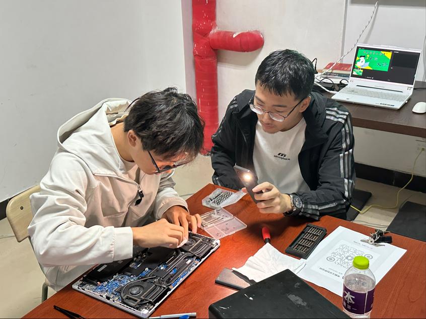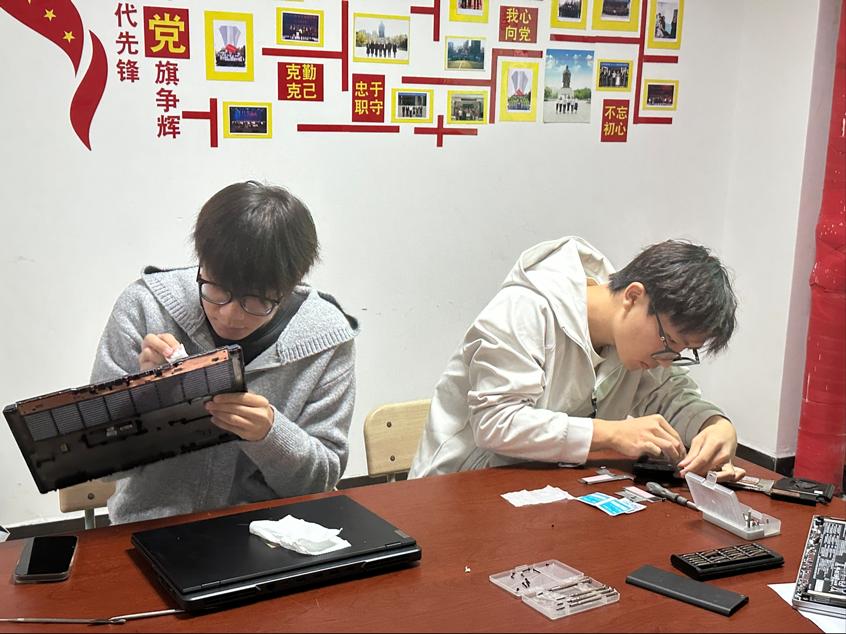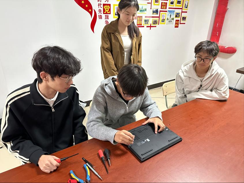 活动伊始,志愿者们提前完成工具调试、场地分区布置等工作,提供“一站式”电脑服务,涵盖拆机清灰、系统重装、软件装卸、磁盘清理、网络安全答疑、操作技巧指导等多元内容。面对不同设备“病症”,他们充分发挥专业所长: 或熟练拆解机箱、精准清理内部积灰,缓解硬件散热难题;或快速重装系统、优化参数设置,提升设备运行效率;或手把手演示文件备份、病毒查杀等实用操作,助力师生提升电脑使用能力。此外,针对有新机购置需求的同学,志愿者们还结合专业知识提供硬件配置、性价比对比等导购建议,全方位守护师生电脑使用体验。