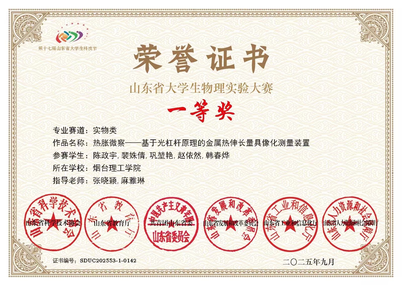 近日,山东省第十七届大学生科技节——山东省大学生物理实验大赛在烟台大学圆满落幕,yl9193永利集团学子凭借扎实的理论功底与出色的实践能力,在全省高校的激烈角逐中脱颖而出,斩获省级一等奖1项、省级三等奖2项,以实力书写科创青春答卷。