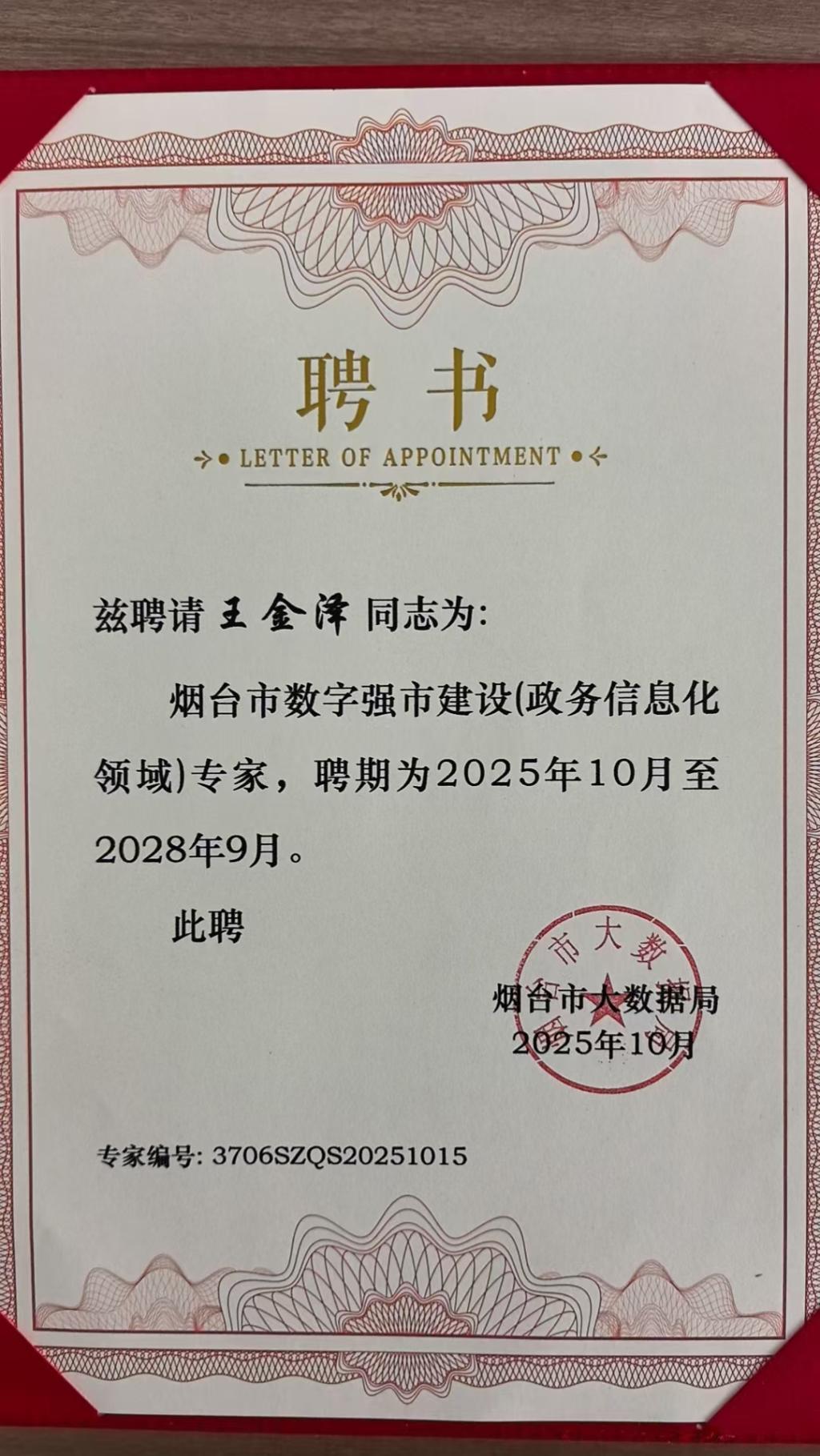 如今,身兼烟台市数字强市建设专家的他,不仅深耕企业研发与管理工作,更积极参与地方数字经济发展规划,为烟台政务信息化建设、智慧城市落地等提供专业支撑,以实际行动践行“技术服务社会”的初心。