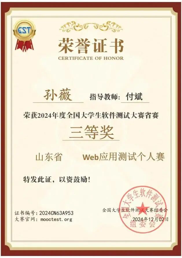 2024 中国大学生计算机设计大赛中,她与团队攻坚项目,从布局设计到代码调试反复优化,逐行校验兼容性问题,最终获省级三等奖。大学生软件测试大赛里,她攻关自动化测试,编写测试脚本、设计百余组用例,高效排查 BUG,凭借严谨的测试方案斩获省级三等奖。