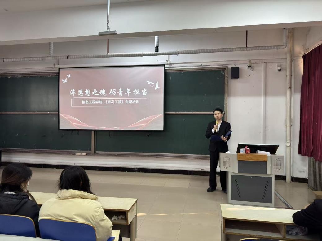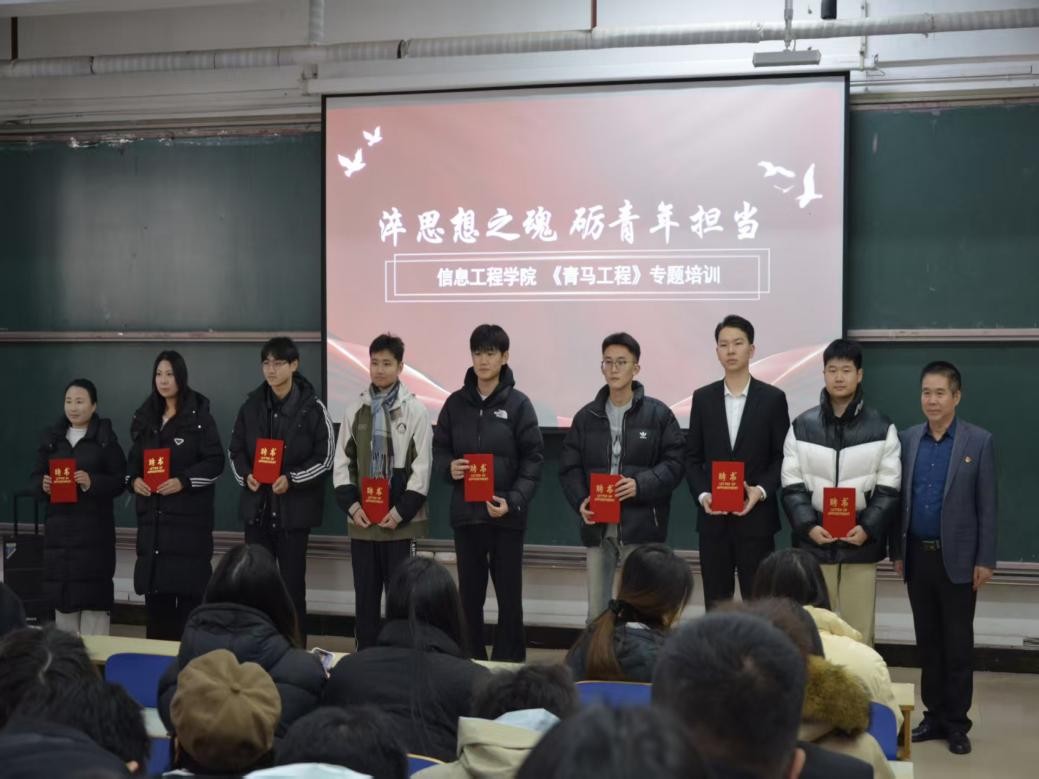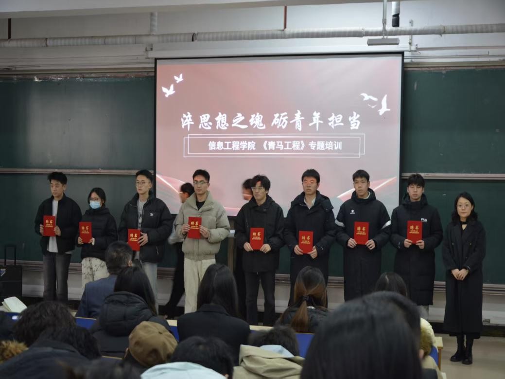 培训紧扣培养青年马克思主义者的核心任务,分三大核心模块有序开展。往届青马工程优秀学员代表陈鲁川围绕思想理论武装模块领学,深入解读马克思主义青年观内涵,引导学员把握理论学习与青年成长的辩证关系,筑牢信仰之基;25届青马工程优秀学员代表孙道洋聚焦学生工作实践模块分享,结合典型案例指导学员明晰履职思路、掌握工作方法,树立“以学促干、以干践学”的理念;团总支学生副书记商潇予立足青年责任担当模块阐释,号召学员在服务同学、投身实践中锤炼本领,以实干彰显担当。随后,王明印书记进行总结,深入阐释青马工程核心要义,肯定过往工作成效,并对全体学生干部提出“三颗心”要求:秉持进取之心,深学马列主义、坚定理想信念;常怀善良之心,践行奉献精神、主动帮助同学;保持平常之心,摒弃功利思想、踏实履职尽责,为学员成长指明方向。最后,王明印、祝箐老师为青马工程优秀学员颁发聘书,表彰其在思想引领、组织建设等工作中的突出表现,激励全体学员以榜样为镜,勇担时代重任。